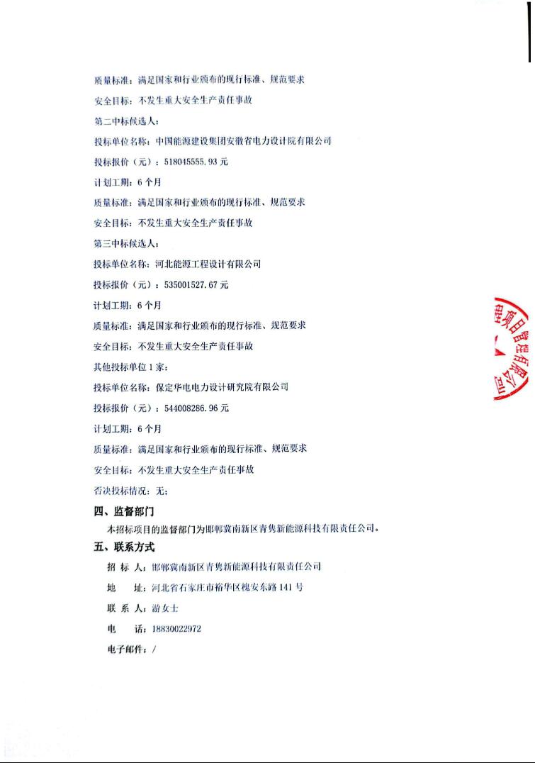 第一中标候选人为中国电建集团河北省电力勘测设计研究院有限公司,投标报价52613.524696万元,折合单价0.8769元/Wh;第二中标候选人为中国能源建设集团安徽省电力设计院有限公司,投标报价51804.555593万元,折合单价0.8634元/Wh;第三中标候选人为河北能源工程设计有限公司,投标报价53500.152767万元,折合单价0.8917元/Wh。