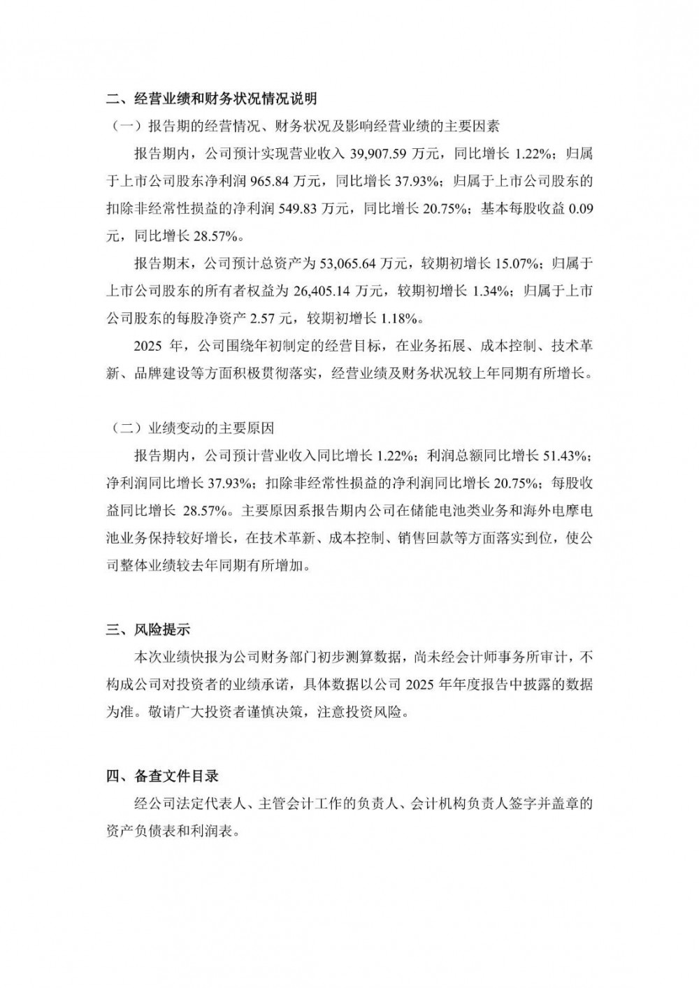 2月26日,天宏锂电发布2025年年度业绩快报公告。报告期内,公司预计实现营业收入39,907.59万元,同比增长1.22%;归属于上市公司股东净利润965.84万元,同比增长37.93%;归属于上市公司股东的扣除非经常性损益的净利润549.83万元,同比增长20.75%;基本每股收益0.09元,同比增长28.57%。