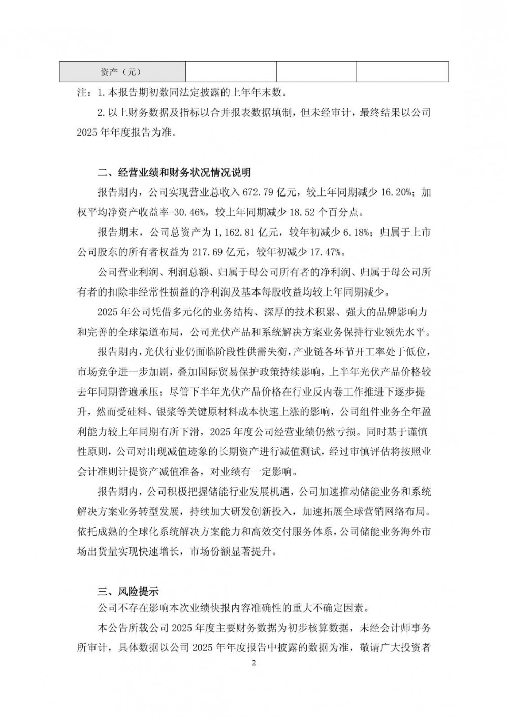 2月26日,天合光能发布2025年度业绩快报公告。报告期内,公司实现营业总收入672.79亿元,较上年同期减少16.20%;加权平均净资产收益率-30.46%,较上年同期减少18.52个百分点。报告期末,公司总资产为1,162.81亿元,较年初减少6.18%;归属于上市公司股东的所有者权益为217.69亿元,较年初减少17.47%。