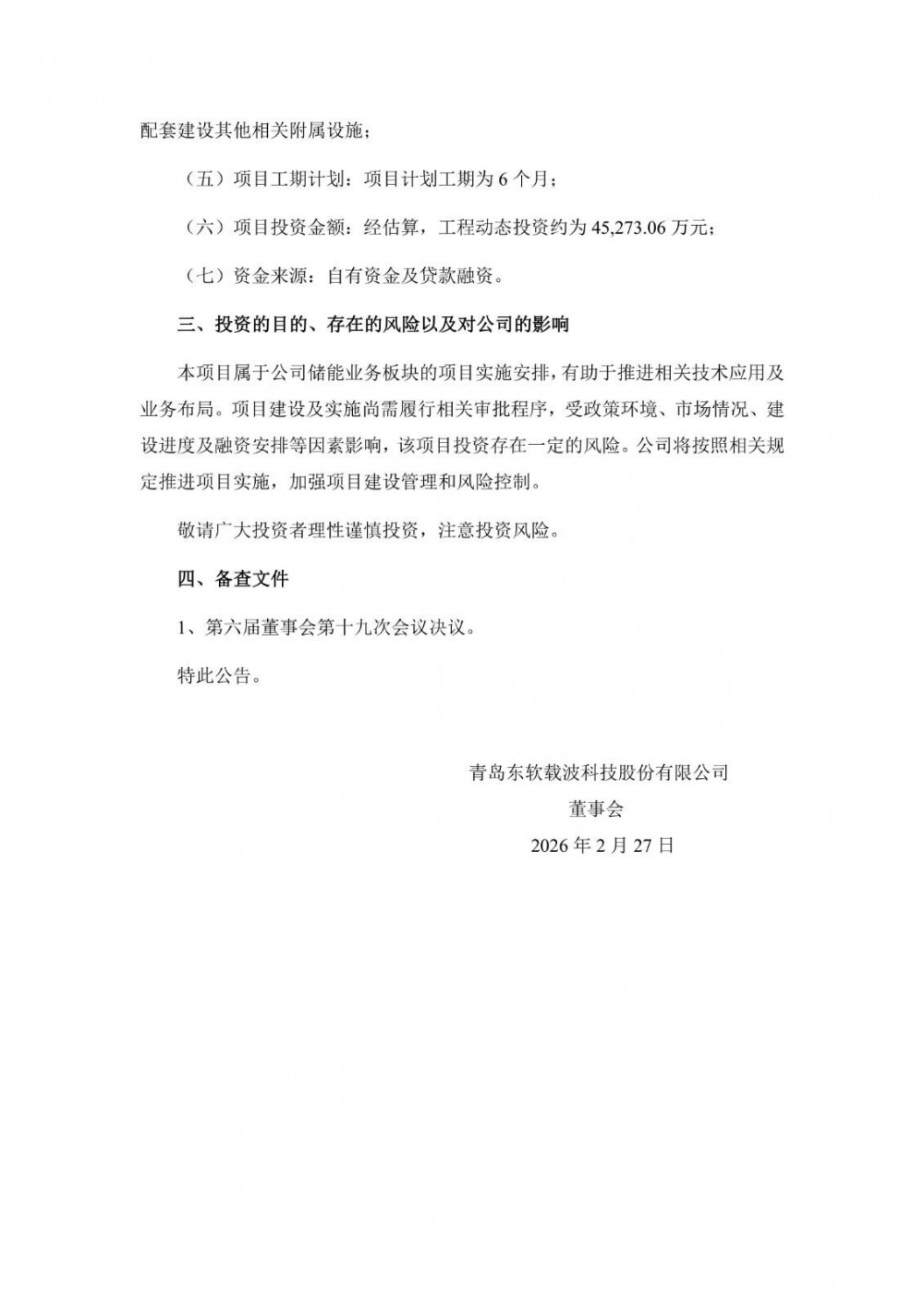 东软载波表示,本项目属于公司储能业务板块的项目实施安排,有助于推进相关技术应用及业务布局。项目建设及实施尚需履行相关审批程序,受政策环境、市场情况、建设进度及融资安排等因素影响,该项目投资存在一定的风险。公司将按照相关规定推进项目实施,加强项目建设管理和风险控制。