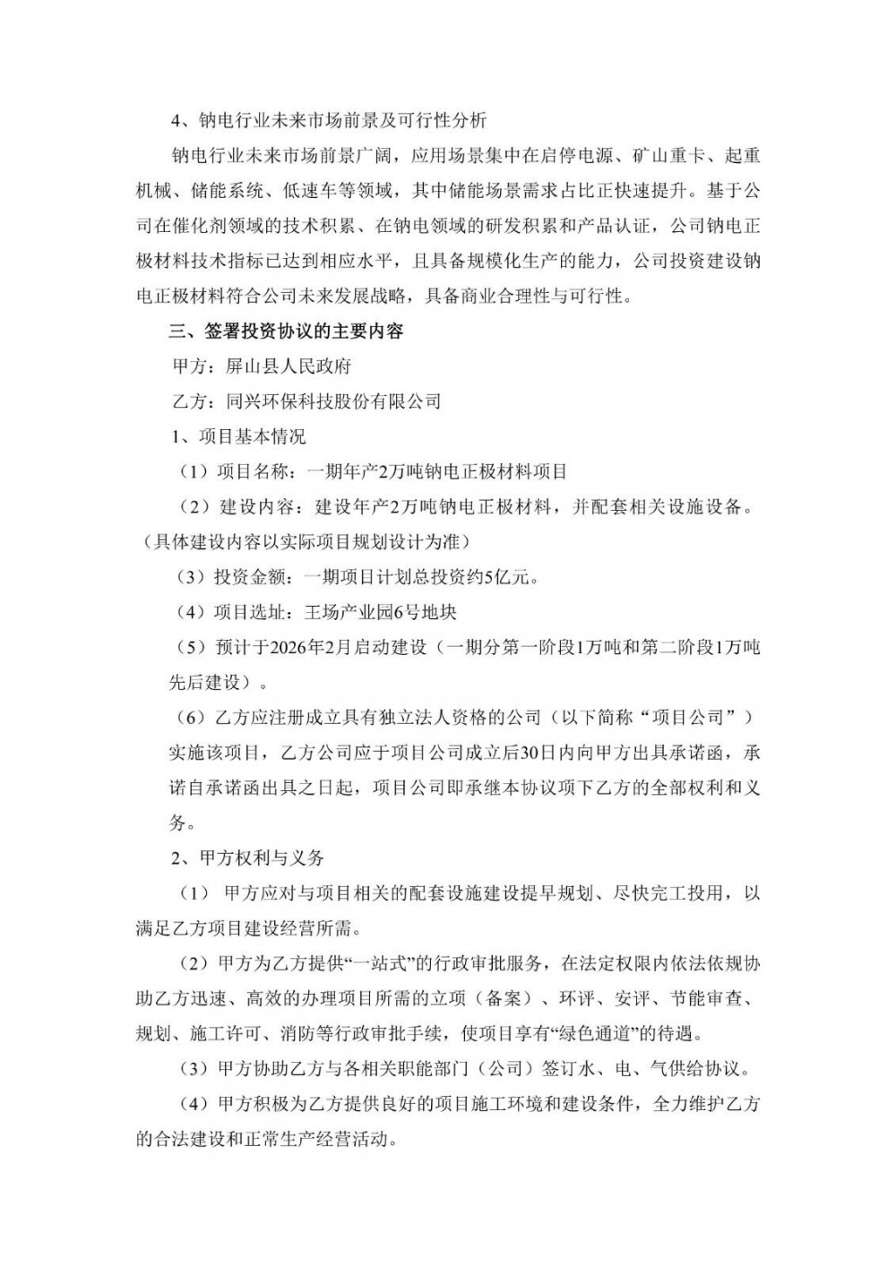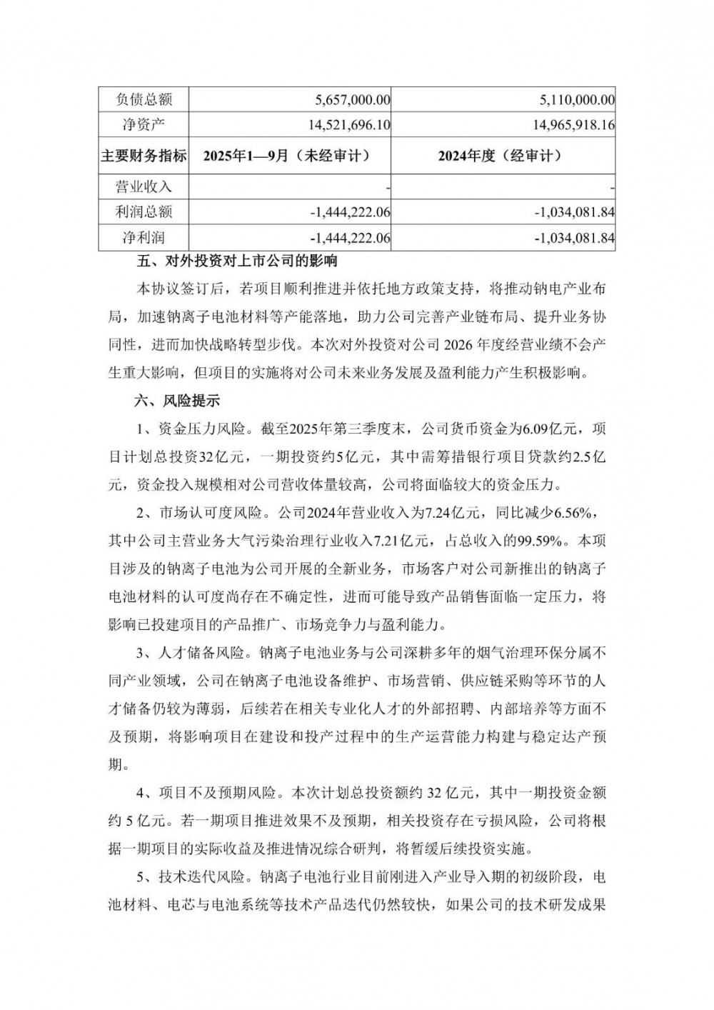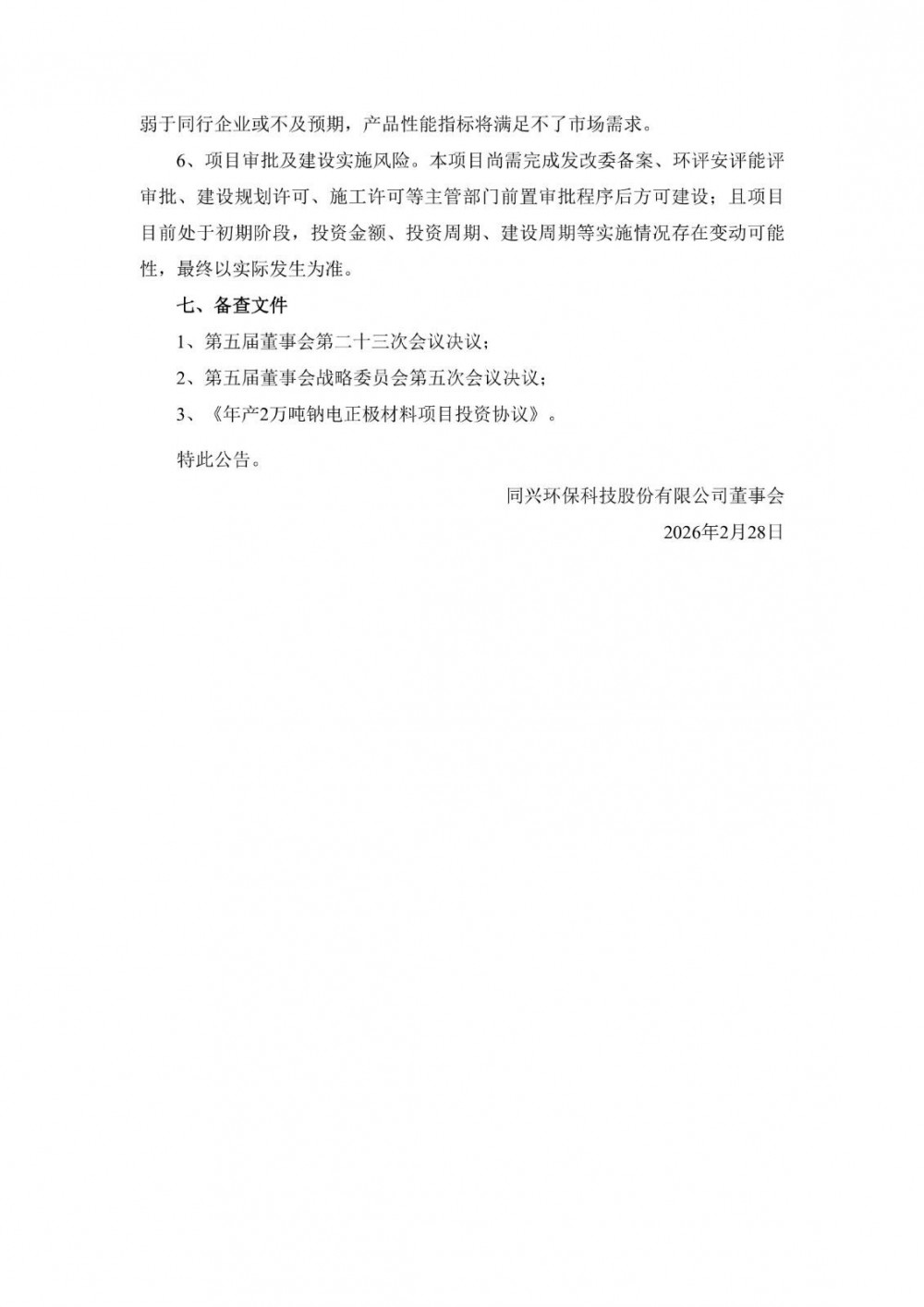 同兴科技表示,本协议签订后,若项目顺利推进并依托地方政策支持,将推动钠电产业布局,加速钠离子电池材料等产能落地,助力公司完善产业链布局、提升业务协同性,进而加快战略转型步伐。本次对外投资对公司2026年度经营业绩不会产生重大影响,但项目的实施将对公司未来业务发展及盈利能力产生积极影响。