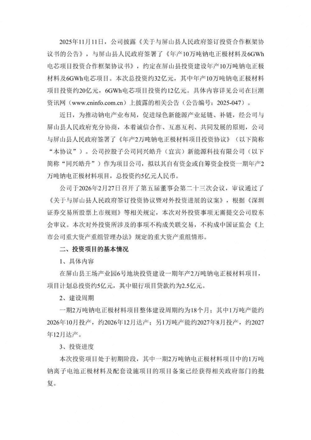 2月27日,同兴科技发布公告称,公司与屏山县人民政府签署了《年产2万吨钠电正极材料项目投资协议》,在屏山县王场产业园6号地块投资建设一期年产2万吨钠电正极材料项目,一期项目计划总投资约5亿元。