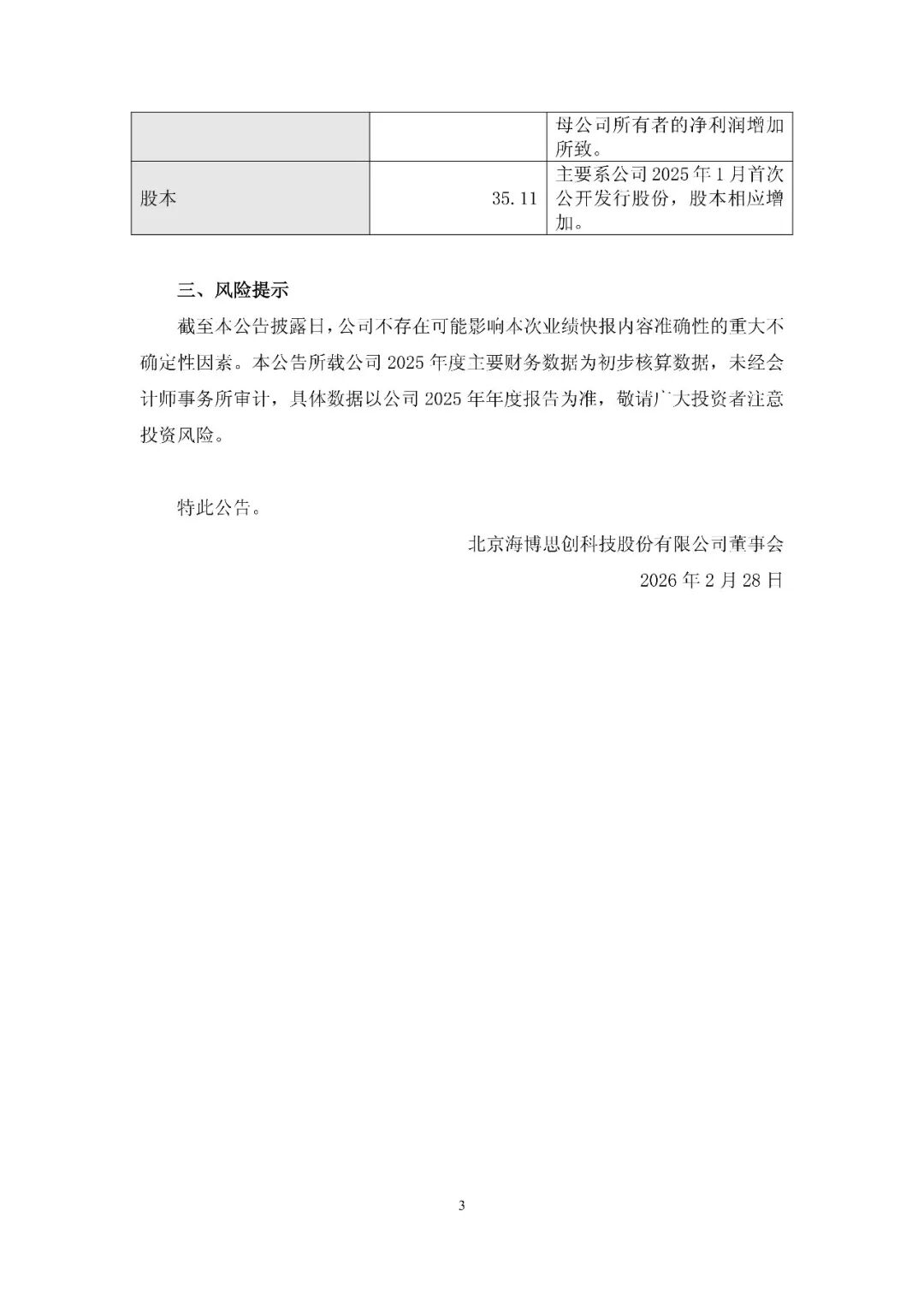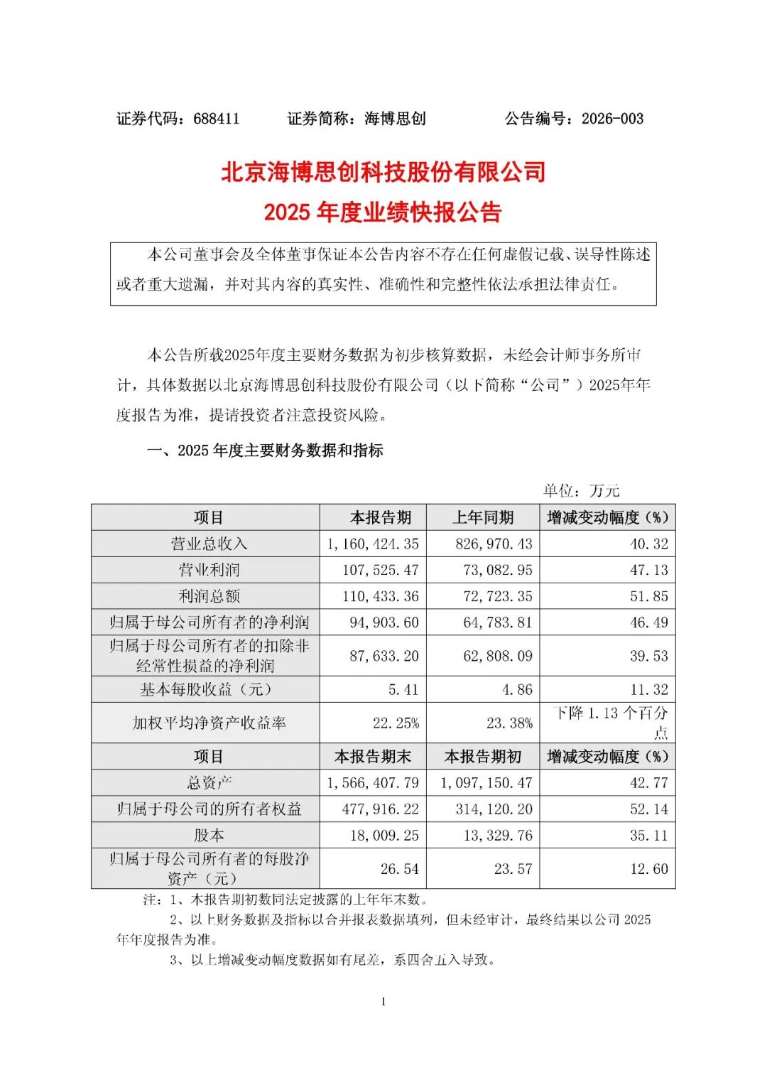 能源圈获悉,2月27日,海博思创发布2025年度业绩快报公告称,公司2025年公司实现营业收入116.04亿元,较上年同期增长40.32%;实现归属于母公司所有者的净利润9.49亿元,较上年同期增长46.49%;实现归属于母公司所有者的扣除非经常性损益的净利润8.76亿元,较上年同期增长39.53%。