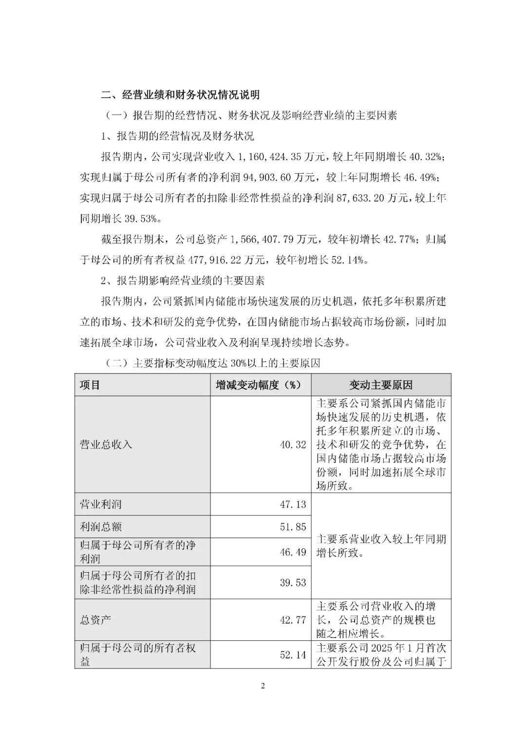 报告期内,公司紧抓国内储能市场快速发展的历史机遇,依托多年积累所建立的市场、技术和研发的竞争优势,在国内储能市场占据较高市场份额,同时加速拓展全球市场,公司营业收入及利润呈现持续增长态势。