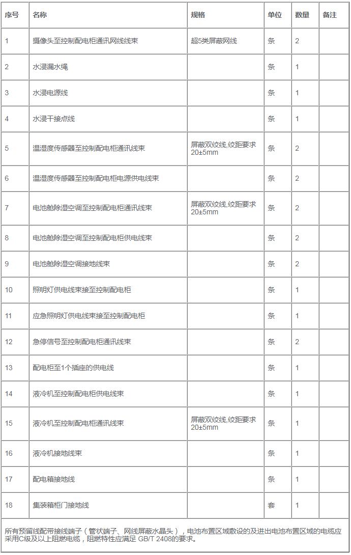 此表为单舱配套的配电柜、汇流柜柜体、空调液冷等设备通讯线、电源线明细(供参考,不足部分由中标人配齐)。