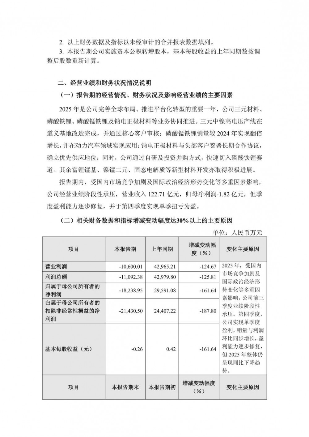 2025年是公司完善全球布局、推进平台化转型的重要一年,公司三元材料、磷酸铁锂、磷酸锰铁锂及钠电正极材料等业务协同推进。三元中镍高电压产线在遵义基地改造完成,并通过核心客户审核;磷酸锰铁锂销量较2024年实现翻倍增长,并在动力汽车领域实现应用;钠电正极材料与头部客户签署长期合作协议,确立优先供应地位;同时,公司通过自研及投资并购方式,快速切入磷酸铁锂赛道。其余富锂锰基、镍锰二元、固态电解质等新型材料开发亦取得积极进展。