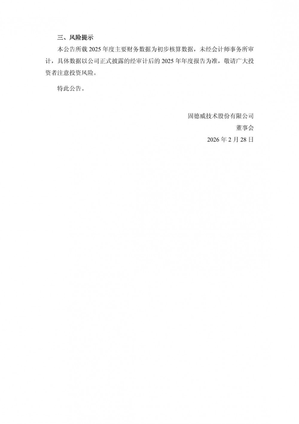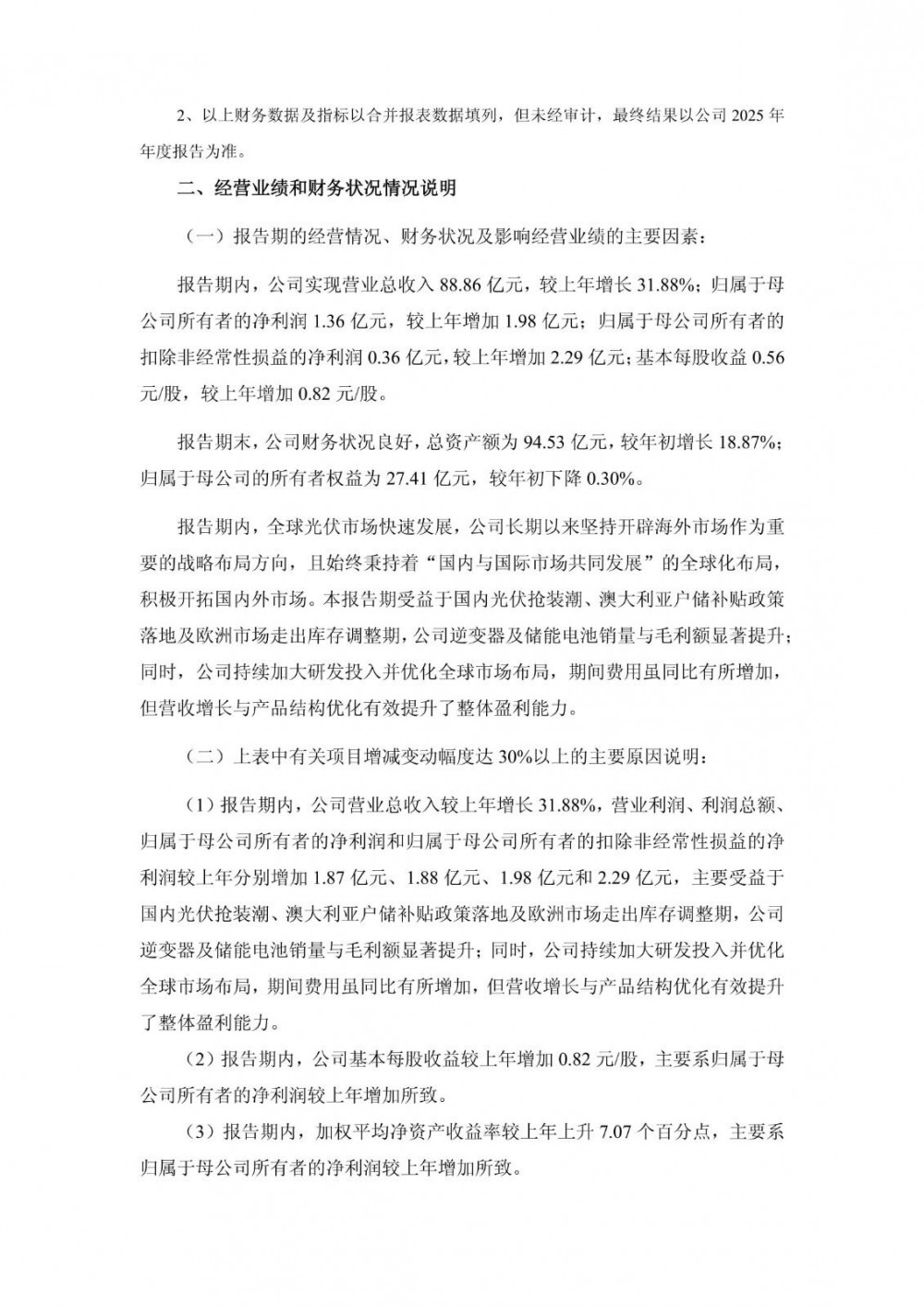 近日,固德威发布2025年度业绩快报公告。报告期内,公司实现营业总收入88.86亿元,较上年增长31.88%;归属于母公司所有者的净利润1.36亿元,较上年增加1.98亿元;归属于母公司所有者的扣除非经常性损益的净利润0.36亿元,较上年增加2.29亿元;基本每股收益0.56元/股,较上年增加0.82元/股。