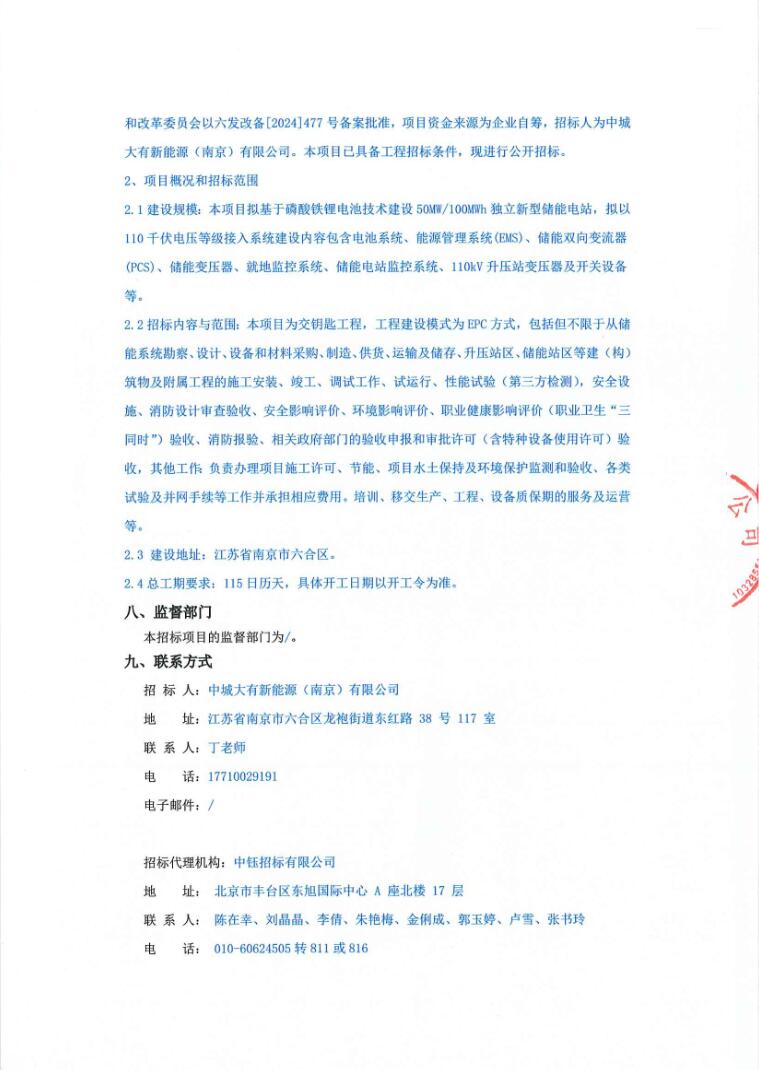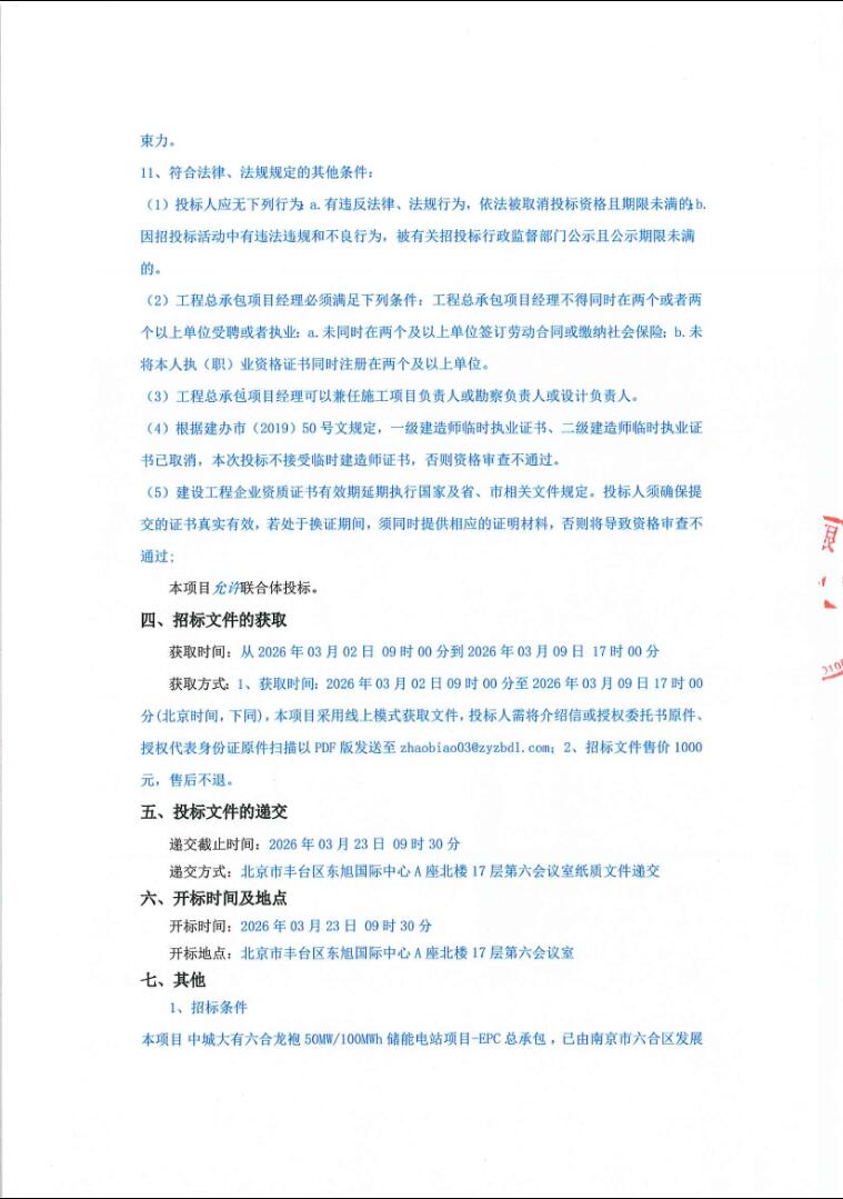2月28日,中城大有六合龙袍50MW/100MWh储能电站项目-EPC总承包招标公告发布。