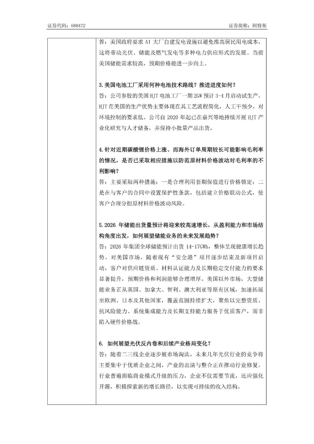 针对近期碳酸锂价格上涨、而海外订单周期较长可能影响毛利率的情况,阿特斯主要采取两种措施:一是合理利用套期保值进行价格锁定;二是在与客户的合同中设置保护性条款,包括建立价格联动公式,使客户合理分担原材料价格波动风险。