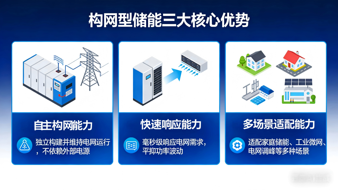 构网型储能的核心技术支撑是虚拟同步机技术,通过软件算法模拟传统同步发电机的运行特性,再结合储能本体的充放电控制,实现对电网的主动支撑。相较于跟网型储能,它具备三大不可替代的技术优势: