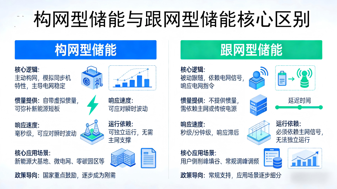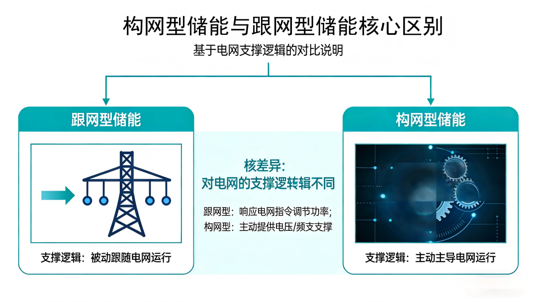 要理解构网型储能,首先要明确它与我们熟知的“跟网型储能”的核心区别——二者的本质差异,在于对电网的“支撑逻辑”不同,通俗来讲,就是“被动跟随”与“主动主导”的区别。