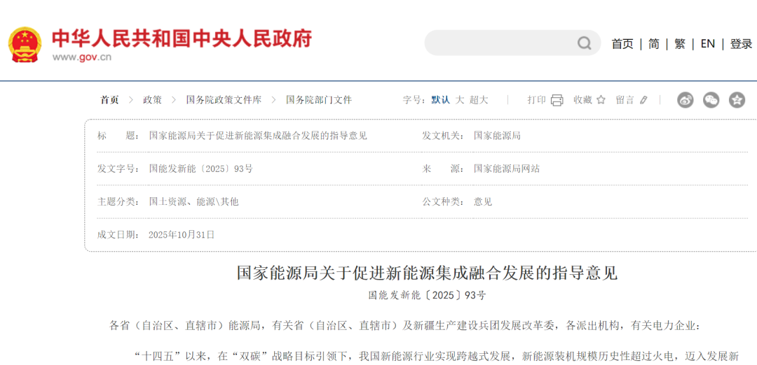 ✅《关于促进新能源集成融合发展的指导意见》(国能发新能〔2025〕93号)