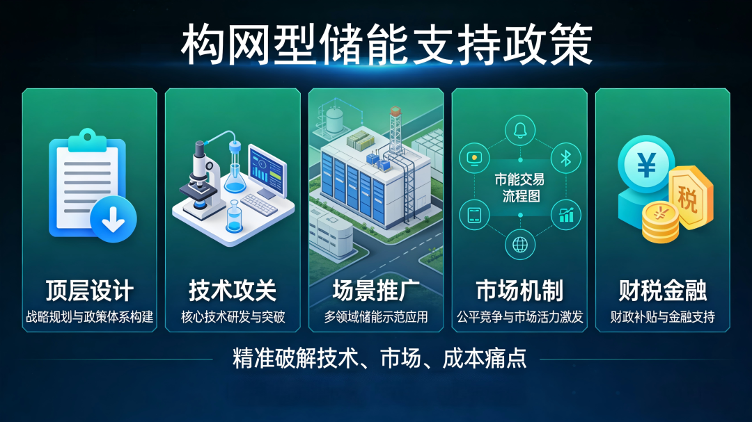 梳理来看,国家层面的支持政策主要集中在“顶层设计、技术攻关、场景推广、市场机制、财税金融”五大维度,覆盖构网型储能从研发到落地的全产业链,精准破解行业发展中的技术、市场、成本痛点。