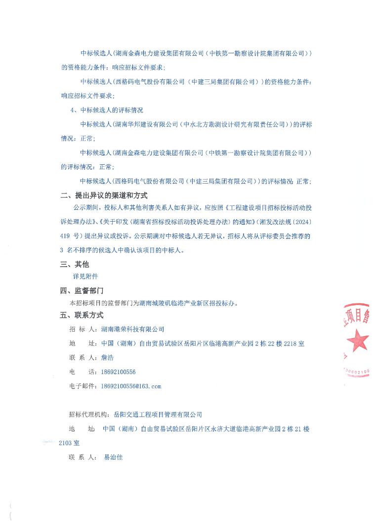 中标候选人第1名为湖南华邦建设有限公司、中水北方勘测设计研究有限责任公司联合体,投标报价为11227.384149万元;中标候选人第2名为湖南金森电力建设集团有限公司、中铁第一勘察设计院集团有限公司联合体,投标报价为11047.993022万元;中标候选人第3名为西格码电气股份有限公司、中建三局集团有限公司联合体,投标报价为11526.168800万元。