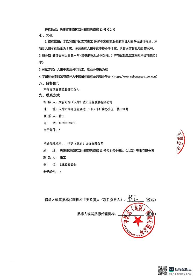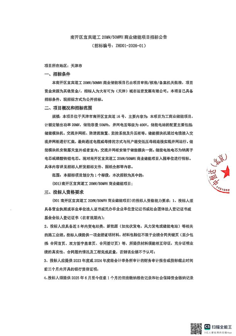 3月4日,南开区宜宾道工20MW/50MWH商业储能项目招标公告发布。