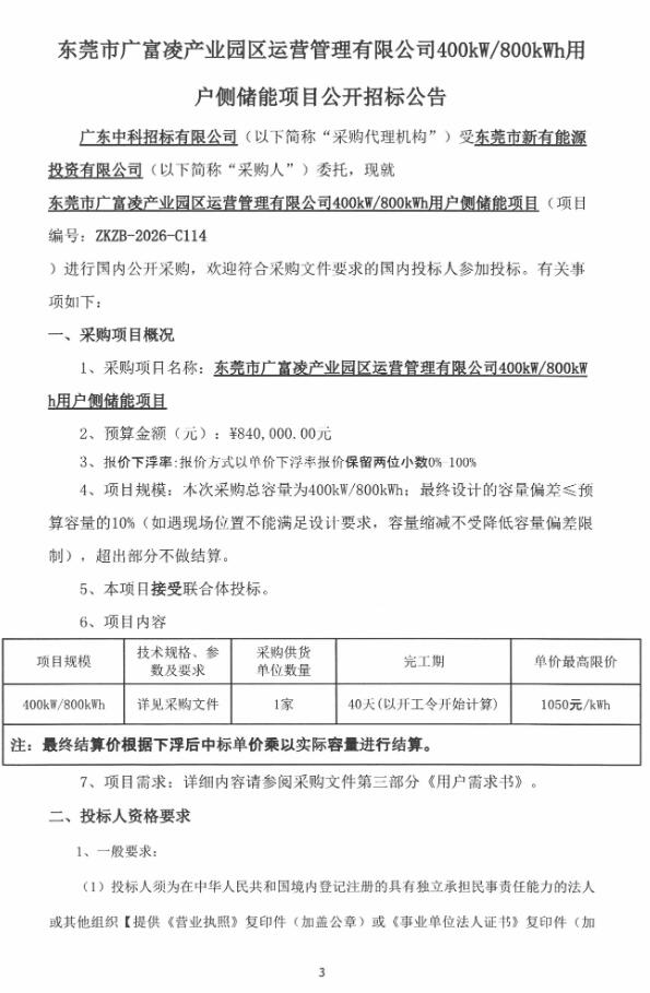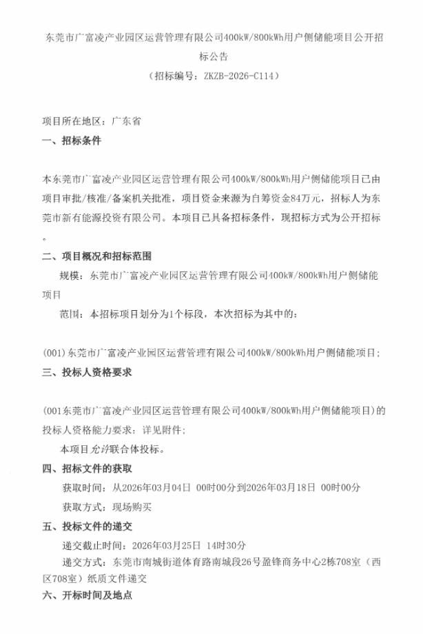 3月4日,东莞市广富凌产业园区运营管理有限公司400kW/800kWh用户侧储能项目公开招标公告发布。