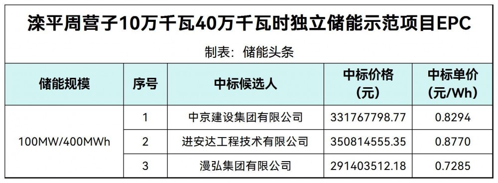 第一中标候选人为中京建设集团有限公司,投标报价331767798.77元,折合单价0.8294元/Wh;第二中标候选人为进安达工程技术有限公司,投标报价350814555.35元,折合单价0.877元/Wh;第三中标候选人为漫弘集团有限公司,投标报价291403512.18元,折合单价0.7285元/Wh。