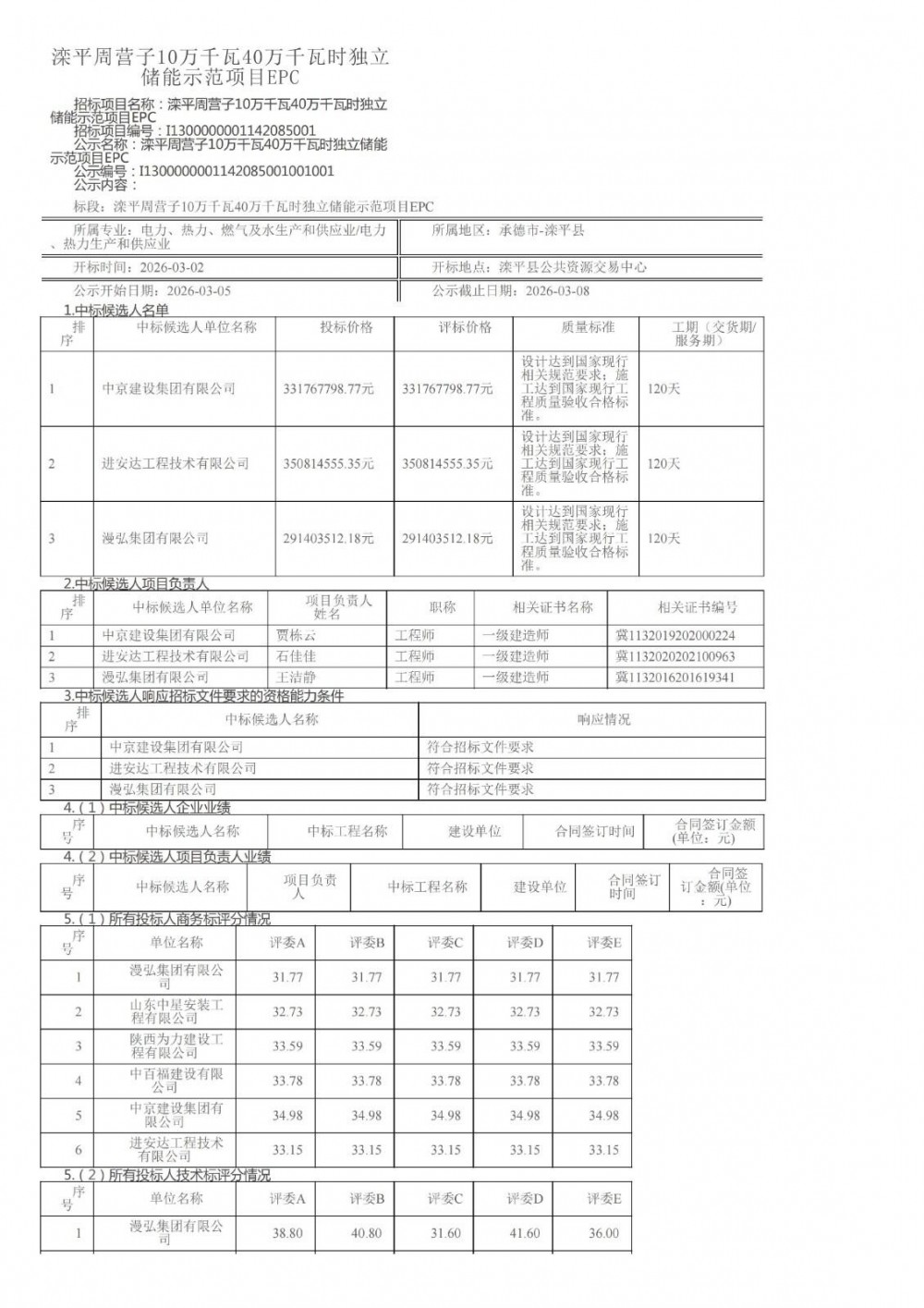 3月5日,滦平周营子10万千瓦40万千瓦时独立储能示范项目EPC中标候选人公示。