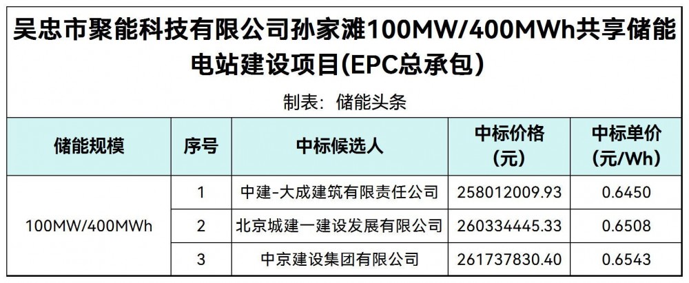 3月5日,吴忠市聚能科技有限公司孙家滩100MW/400MWh共享储能电站建设项目(EPC总承包)中标候选人公示。