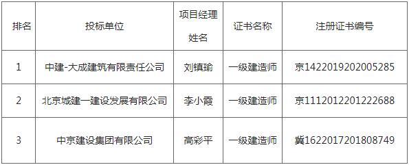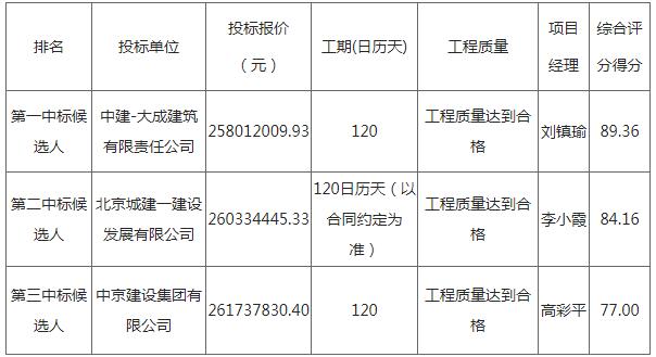 第一中标候选人为中建-大成建筑有限责任公司,投标报价258012009.93元,折合单价0.645元/Wh;第二中标候选人为北京城建一建设发展有限公司,投标报价260334445.33元,折合单价0.6508元/Wh;第三中标候选人为中京建设集团有限公司,投标报价261737830.4元,折合单价0.6543元/Wh。