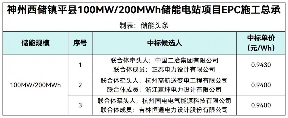 第一中标候选人为中国二冶集团有限公司、正泰电力设计有限公司联合体,投标报价315000000元,折合单价0.943元/Wh;第二中标候选人为杭州高航送变电工程有限公司、浙江赢坤电力设计有限公司联合体,投标报价311000000元,折合单价0.94元/Wh;第三中标候选人为杭州国电电气能源科技有限公司、吉林恒通电力设计股份有限公司联合体,折合单价0.94元/Wh。