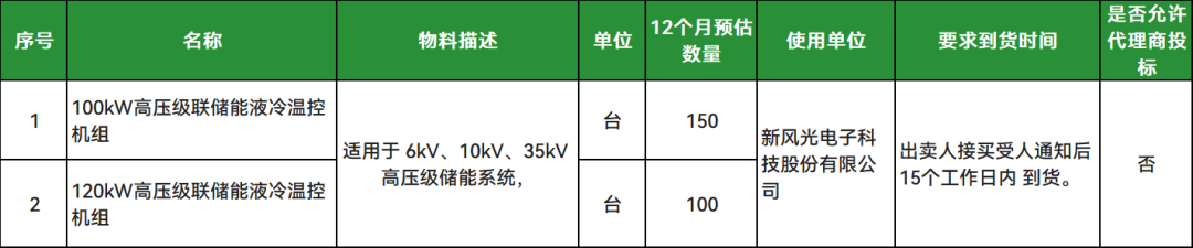 采购100kW高压级联储能液冷温控机组,150台,采购120kW高压级联储能液冷温控机组,100台。