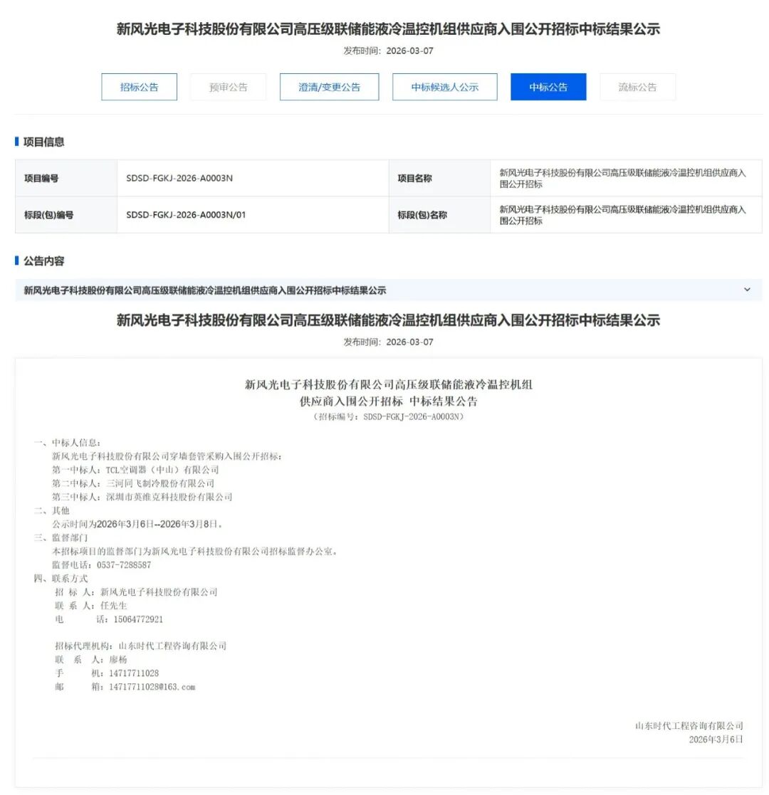 能源圈获悉,3月7日,新风光电子科技股份有限公司高压级联储能液冷温控机组供应商入围公开招标中标结果公示,第一中标人是TCL空调器(中山)有限公司;第二中标人是三河同飞制冷股份有限公司;第三中标人是深圳市英维克科技股份有限公司。