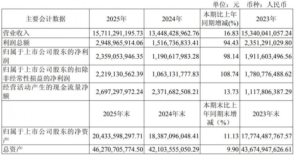 3月5日,璞泰来发布2025年年度报告。2025年度,公司实现营业收入157.11亿元,同比增加16.83%,实现归属于上市公司股东的净利润23.59亿元,同比增加98.14%。