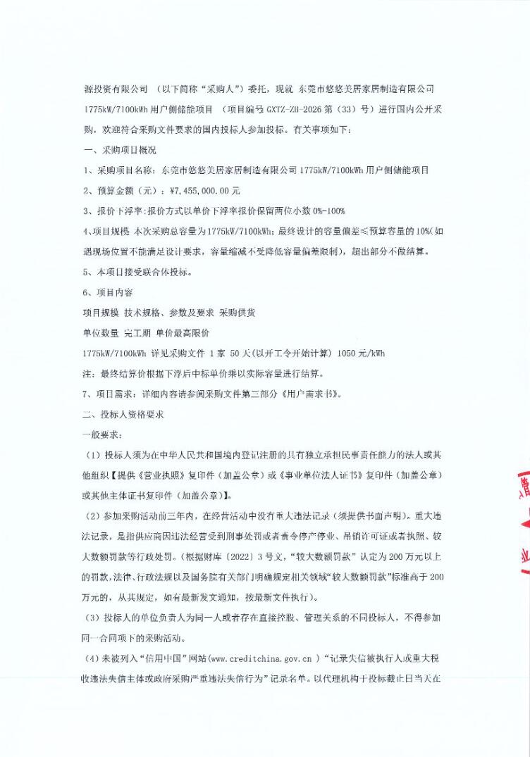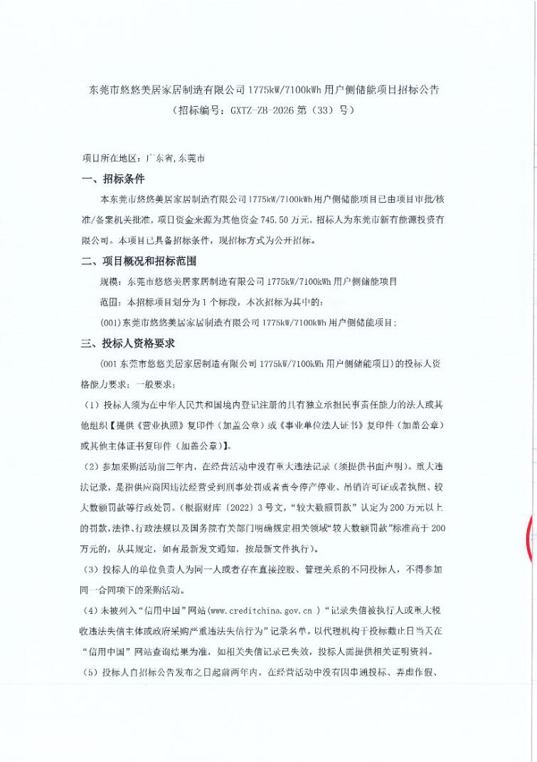 3月5日,东莞市悠悠美居家居制造有限公司1775kW/7100kWh用户侧储能项目招标公告发布。