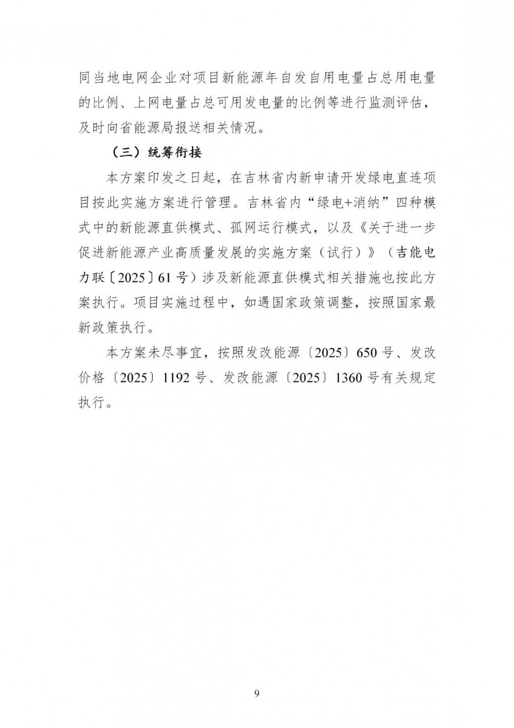 按照国家发展改革委、国家能源局《关于有序推动绿电直连发展有关事项的通知》(发改能源〔2025〕650号)、《关于完善价格机制促进新能源发电就近消纳的通知》(发改价格〔2025〕1192号)、《关于促进新能源消纳和调控的指导意见》(发改能源〔2025〕1360号)等文件要求,省能源局 省发展改革委研究制定了《吉林省绿电直连项目开发建设实施方案(试行)》,经省政府同意,现印发你们,请认真抓好贯彻落实。
