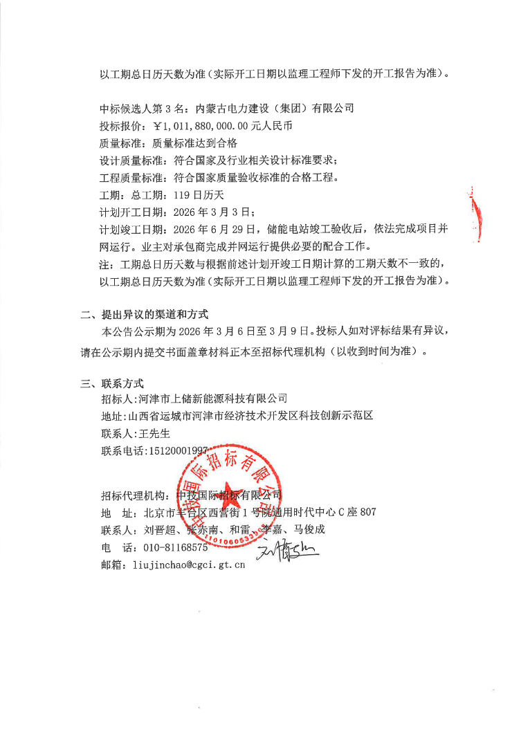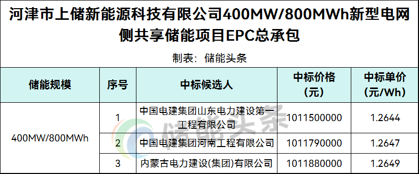 第一中标候选人为中国电建集团山东电力建设第一工程有限公司,投标报价1011500000元,折合单价1.2644元/Wh;第二中标候选人为中国电建集团河南工程有限公司,投标报价1011790000元,折合单价1.2647元/Wh;第三中标候选人为内蒙古电力建设(集团)有限公司,投标报价1011880000元,折合单价1.2649元/Wh。