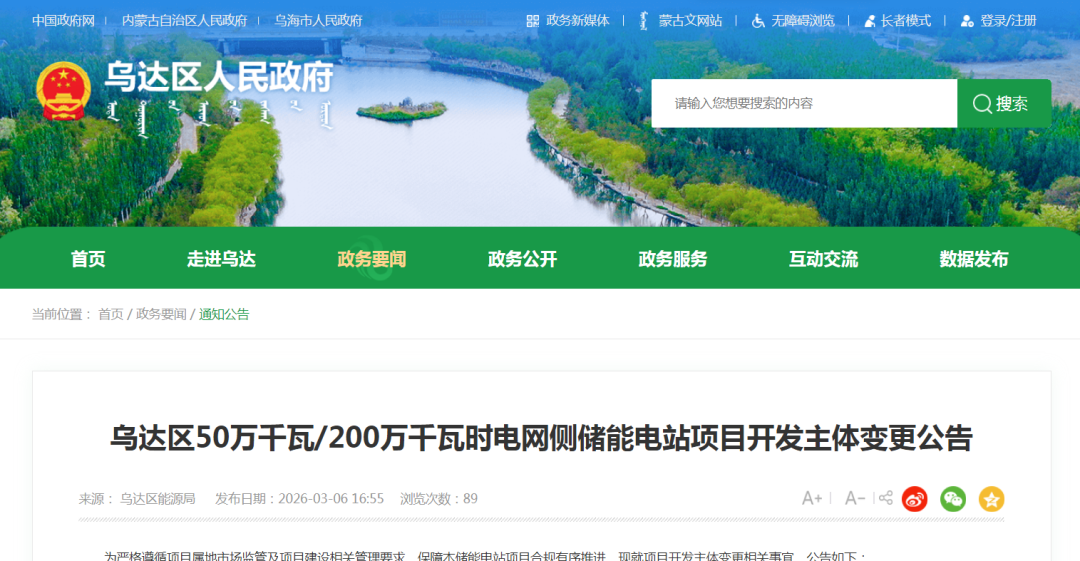 乌达区50万千瓦/200万千瓦时电网侧储能电站项目开发主体变更公告