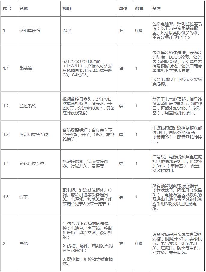 2.2 招标范围:600套5MWh储能电池系统配套用20尺液冷集装箱,包括储能电池集装箱、视频监控、照明及应急照明系统、动环监控、配电线路及其他辅助设备等,详见表1招标采购范围与表2备品备件清单。本项目采购数量为预估采购量,有效期内可能存在因需求变化造成采购量减少的情况。本次招标确定的产品价格若遇不可控因素或者市场重大变化,双方协商价格调整比例。