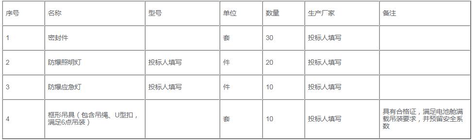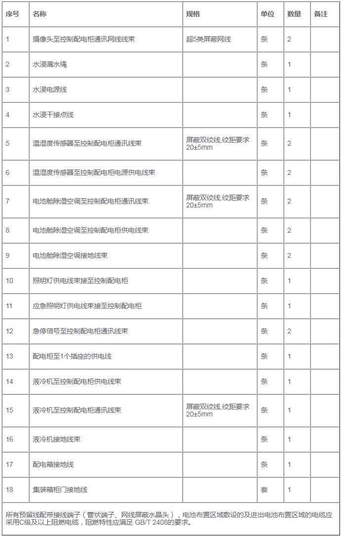 此表为单舱配套的配电柜、汇流柜柜体、空调液冷等设备通讯线、电源线明细(供参考,不足部分由中标人配齐)。
