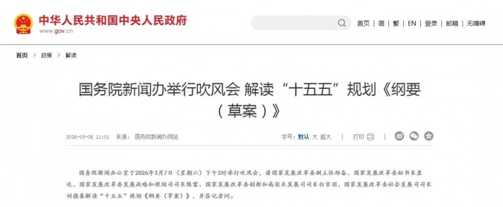 3月7日下午,国务院新闻办公室举行吹风会,解读“十五五”规划《纲要(草案)》。国家发展改革委副主任郑备,秘书长袁达,发展战略和规划司司长陈雷、创新和高技术发展司司长白京羽、社会发展司司长刘德春出席吹风会,解读“十五五”规划《纲要(草案)》并答记者问。
