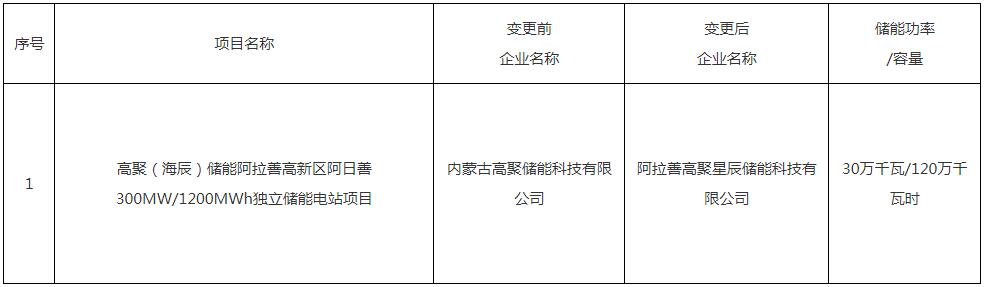按照《内蒙古自治区能源局关于规范独立新型储能电站管理有关事宜的通知》(内能源电力字〔2025〕656号)、《内蒙古自治区能源局关于组织申报2026年独立新型储能建设项目清单的通知》(内能源电力字〔2025〕753号)和《阿拉善盟能源局关于组织申报电网侧独立新型储能电站示范项目的通知》(阿能源发〔2025〕63号)等文件要求,阿拉善高新技术产业开发区2026年电网侧独立新型储能电站示范项目的优选结果已于2026年1月27日至1月29日公示。按照自治区和阿拉善盟相关要求,项目开发主体需成立属地公司,本次开发主体变更仅为满足属地注册管理要求,项目产权归属、股权结构、投资主体均未发生任何变化,以下新注册公司为原申报公司的全资子公司,原项目相关权利、义务及责任均由新开发主体全面承继,项目投资规模、建设规划、运营模式等核心内容保持不变。现将成立属地公司的项目予以公示(详见附件)。