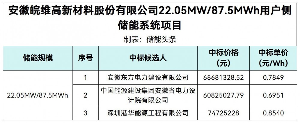 第一中标候选人为安徽东方电力建设有限公司,投标报价68681328.52元,折合单价0.7849元/Wh;第二中标候选人为中国能源建设集团安徽省电力设计院有限公司,投标报价60825027.79元,折合单价0.6951元/Wh;第三中标候选人为深圳港华能源工程有限公司,投标报价74725228元,折合单价0.854元/Wh。