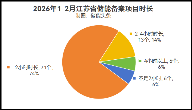 从备案项目储能时长来看,2小时储能仍是市场投资的主流。根据1-2月江苏储能备案项目公开信息统计得知,储能时长主要以2小时时长为主,占到74%;2-4小时储能占14%;不足2小时和4小时以上的占比较少,分别约为6%和6%。