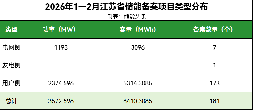 1-2月江苏省储能备案电站项目有181个,总备案规模3572.596MW/8410.3085MWh,主要包括用户侧分布式储能、电网侧储能两种类型为主。