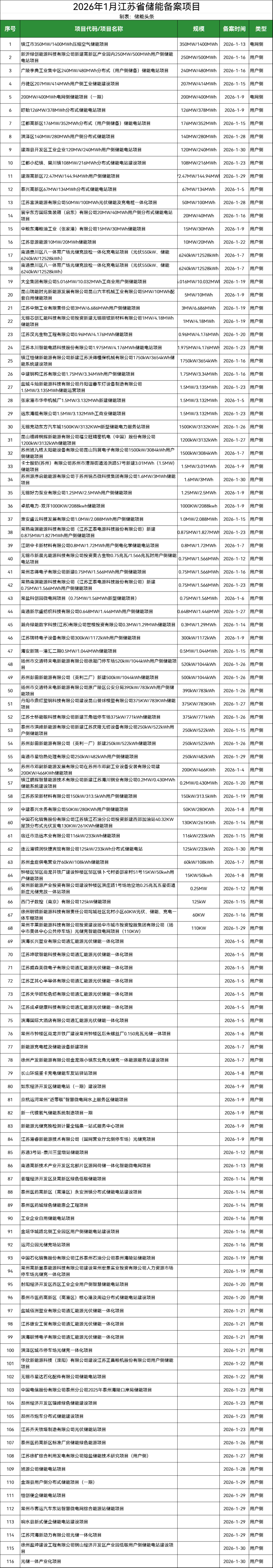 根据能源圈对公开信息不完全统计,2026年1月江苏省共完成116个储能项目备案,备案规模2210.38MW/5254.76MWh,备案项目有储能电站、分布式用户储能以及光储充项目等。