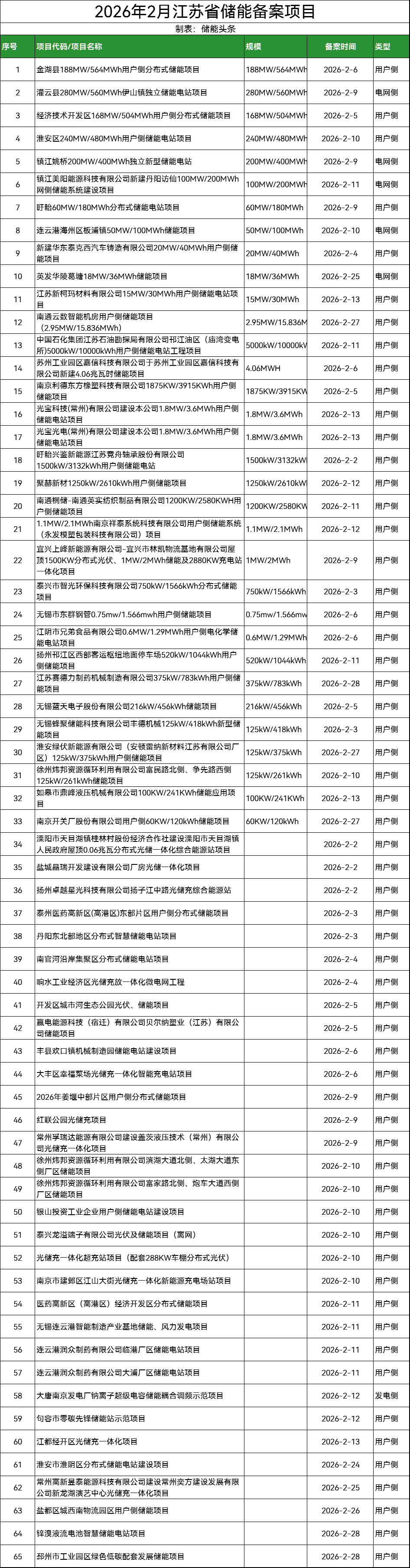 2026年2月江苏共完成65个储能项目备案,规模1362.22MW/3155.55MWh。