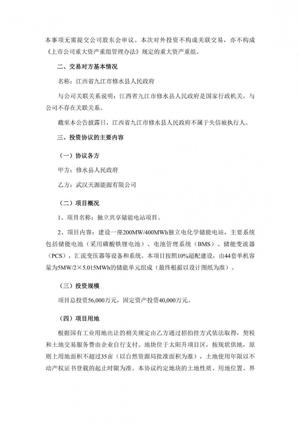 3月10日,武汉天源发布公告称,公司控股子公司武汉天源能源有限公司与江西省九江市修水县人民政府拟就投资建设“独立共享储能电站项目”签署《投资协议书》,项目总投资5.6亿元。