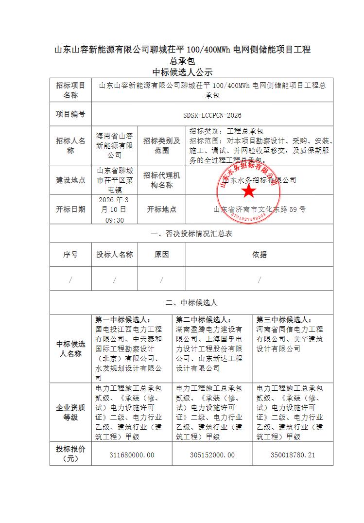 3月10日,山东山容新能源有限公司聊城茌平100/400MWh电网侧储能项目工程总承包候选人公示。