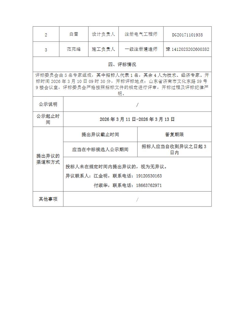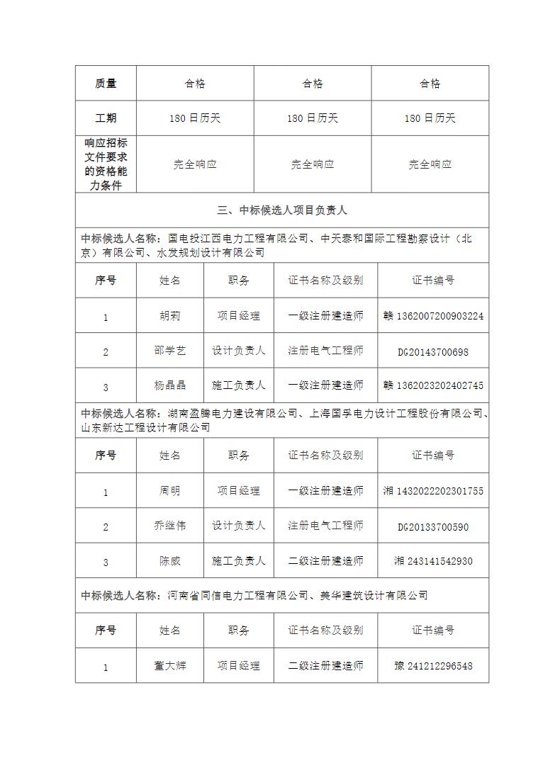 第一中标候选人为国电投江西电力工程有限公司、中天泰和国际工程勘察设计(北京)有限公司、水发规划设计有限公司联合体,中标价格为311680000元,中标单价为0.7792元/Wh;第二中标候选人为湖南盈腾电力建设有限公司、上海国孚电力设计工程股份有限公司、山东新达工程设计有限公司联合体,中标价格为305152000元,中标单价为0.7629元/Wh;第三中标候选人为河南省同信电力工程有限公司、美华建筑设计有限公司联合体,中标价格为350018780.21元,中标单价为0.875元/Wh。