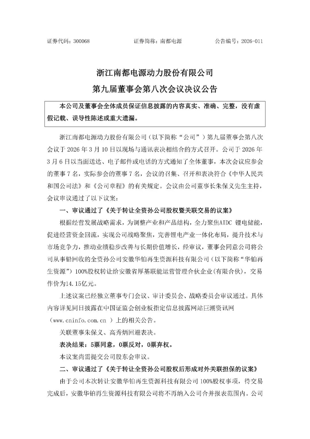 能源圈获悉,3月13日,南都电源发布《第九届董事会第八次会议决议公告》,会议审议通过了《关于转让全资孙公司股权暨关联交易的议案》,拟以14.15亿元将从事铅回收的全资孙公司华铂再生资源100%股权转让给安徽省厚基联能运营管理合伙企业。
