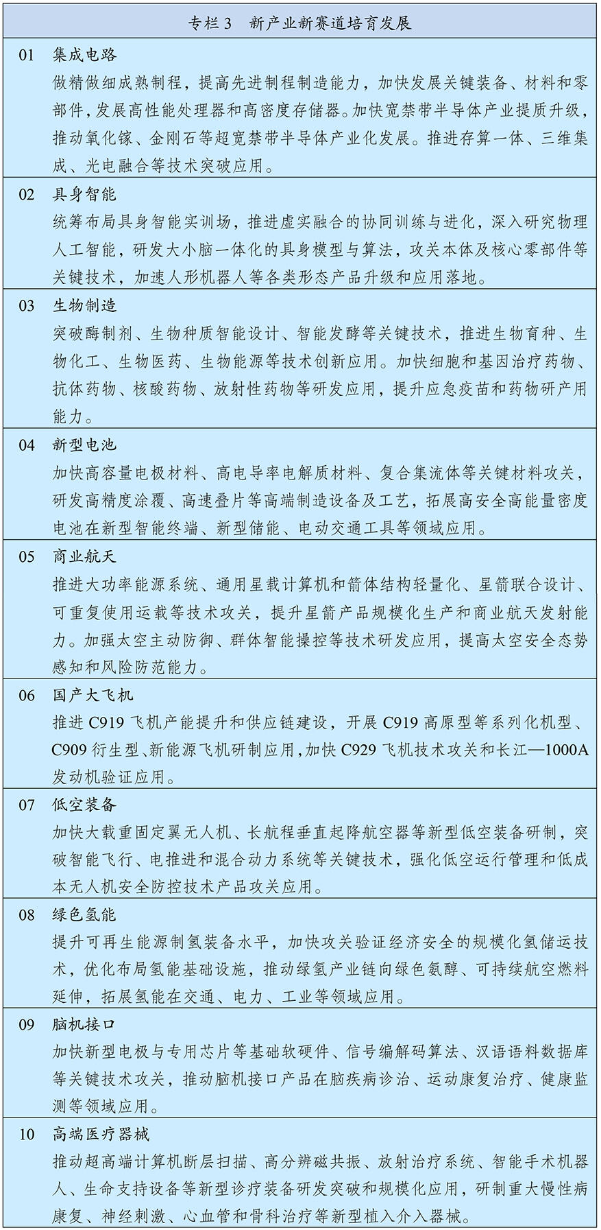 发展壮大新兴产业。加快新一代信息技术、新能源、新材料、智能网联新能源汽车、机器人、生物医药、高端装备、航空航天等战略性新兴产业发展,因地制宜建设各具特色、优势互补的战略性新兴产业集群,着力打造一批成长潜力大、技术含量高、渗透领域广的新兴支柱产业。拓展海洋经济发展空间,推进低空经济健康有序发展。实施新技术新产品新场景大规模应用示范行动,加大场景培育和开放力度,加快新兴产业规模化发展。鼓励发展战略性产品和服务,推进国产大飞机规模化系列化发展,加强北斗系统创新应用,扎实推进智能驾驶、新型太阳能电池、新型储能等关键技术创新,支持创新药临床使用。
