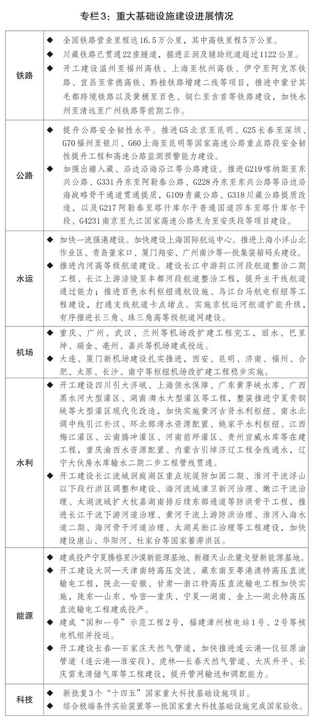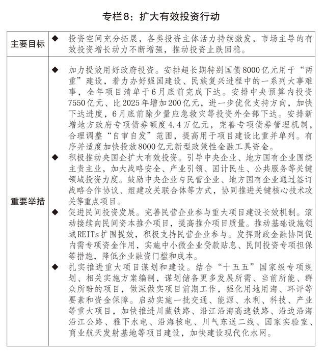 二是投资补短板调结构加力增效。统筹用好各类资金支持重点项目建设,持续优化中央预算内投资结构,扩大地方政府专项债券投向领域和用作资本金范围,指导专项债券“自审自发”地区扎实有序开展相关工作。推动“十四五”规划102项重大工程项目顺利实现规划目标任务,开工建设雅下水电等标志性工程。现代化基础设施体系建设深入推进,国家综合立体交通网“6轴7廊8通道”加速完善。规范和加强中央投资项目审批管理,提高政府投资效益。出台进一步促进民间投资发展政策措施。滚动向民间资本推介5400多个项目,涉及总投资超过3.9万亿元。加大基础设施竞争性领域向各类经营主体公平开放力度,5个新核准核电项目引入民间资本参股比例最高达20%,大渡河丹巴水电站等项目加快引入民间资本。推动基础设施领域不动产投资信托基金(REITs)扩围扩容,算力设施、城镇供热、农贸市场、城市更新、专业仓库等领域实现“首单”发行。2025年工业投资、制造业投资分别增长2.6%、0.6%。