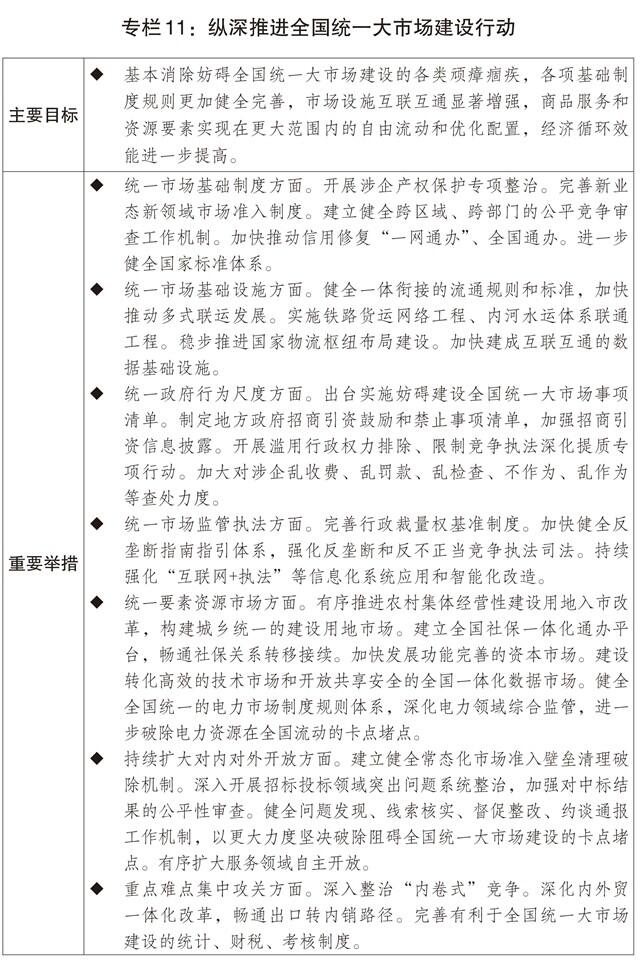 一是加快破除阻碍全国统一大市场建设卡点堵点。制定全国统一大市场建设条例、纵深推进全国统一大市场建设工作方案,持续清理和废除妨碍全国统一市场和公平竞争的各种规定和做法。推动市场准入效能评估省、市、县三级全覆盖。出台地方政府招商引资鼓励和禁止事项清单,规范税收优惠、财政补贴政策。深化综合交通运输体系改革,持续降低全社会物流成本,健全高效顺畅的现代流通体系,加快市场基础设施高标准联通相关改革,实施多式联运攻坚行动,深入推进“一单制”、“一箱制”发展。继续推动大宗商品骨干流通走廊建设,加快建设大宗商品资源配置枢纽,提高国家物流枢纽、国家骨干冷链物流基地、国家邮政快递枢纽的物流集散和区域辐射能力。纵深推进全国统一电力市场建设。加快推动制修订社会信用建设法、价格法等。深化统计、财税、考核制度改革,完善有利于全国统一大市场建设的激励约束机制。