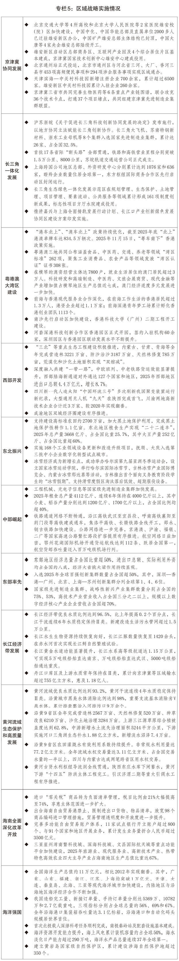 一是区域发展协调性不断增强。三大动力源地区引领带动作用巩固提升,北京非首都功能疏解项目分批压茬推进,雄安新区当年完成投资2116亿元,北京城市副中心综合承载力不断增强,支持天津滨海新区提升先进制造研发转化能力等55条政策措施落地见效,京津冀交通、生态、科技创新、产业等领域协同发展水平持续提升;上海建设国际经济、金融、贸易、航运、科技创新“五个中心”的一批首创性改革、引领性开放措施落地实施,长三角生态绿色一体化发展示范区在科研平台建设等方面获得新一轮改革授权,跨省域医联体医师便利执业等一体化制度创新经验发布推广;“深圳-香港-广州”集群首次跃居全球创新集群首位,横琴合作区第二阶段建设44项政策举措出台实施,前海、南沙、河套开发建设实现新突破。四大板块发展均衡性稳步增强,推进西部大开发形成大保护、大开放、高质量发展的新格局,在云南瑞丽、广西钦防等沿边地区设立产业协作园区,特色优势产业加快集聚;东北全面振兴深入推进,维护国家国防、粮食、生态、能源、产业“五大安全”的能力不断增强;中部崛起战略实施取得积极成效,全国重要粮食生产基地、能源原材料基地、现代装备制造及高技术产业基地和综合交通运输枢纽“三基地一枢纽”战略定位不断夯实;东部地区现代化加快推进,福建全方位推动高质量发展取得新成效,平潭综合实验区、济南新旧动能转换起步区建设扎实推进。长江、黄河两条绿色发展带建设深入推进,长江大保护三年行动计划取得良好开局,生活污水管网补短板、工业园区水污染整治、沿江1公里化工腾退地块土壤污染治理等专项行动加快实施,长江十年禁渔成效不断巩固;黄河干支流堤防加固、排污口排查整治、城镇污水处理能力提升等工作扎实推进,钢铁、化工等重点行业用水效率持续提升。海南自由贸易港正式启动全岛封关运作,实施“一线”放开、“二线”管住、岛内自由的进出口管理制度。海洋强国建设走深走实,全年海洋生产总值约11万亿元,海洋水产品产量、船舶与海洋工程装备市场份额、海运量、海上风电累计装机规模等稳居全球首位,近岸海域水质优良比例达84.9%。