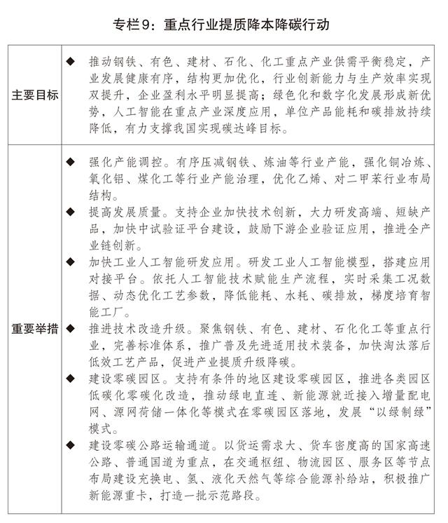 一是积极稳妥推进碳达峰。全面实施碳排放双控制度,制定实施碳达峰碳中和综合评价考核办法和更高水平更高质量做好节能降碳工作的意见,扎实开展“十五五”碳达峰行动,建立可再生能源消费最低比重目标制度。坚决遏制高耗能高排放项目盲目发展,严格实施固定资产投资项目节能审查和碳排放评价,对新上高耗能高排放工业项目实施碳排放等量或减量置换。深入推进重点行业节能降碳改造,依法依规淘汰落后产能。制定能源强国建设规划纲要,加快新型能源体系建设,有序推进“沙戈荒”新能源、西南“水风光”清洁能源和采煤沉陷区新能源基地建设,加快推进跨省清洁能源输电通道规划建设,因地制宜发展分布式能源,积极发展抽水蓄能、新型储能,加快智能电网建设。推动煤炭消费清洁替代,开展煤电和煤化工低碳化改造,推动现代煤化工与绿氢、生物质等新能源耦合发展,加快淘汰落后燃煤设施设备。推进零碳园区和零碳工厂建设,推进氢能综合应用,启动零碳公路运输通道示范路段建设。制修订一批能耗强制性标准和碳排放管理相关标准,强化行业、企业、项目、产品碳排放管理支撑。完善碳排放统计核算、碳足迹管理体系,建立绿色贸易进出口统计制度和监测体系。进一步扩大碳排放权交易市场覆盖范围,完善全国温室气体自愿减排交易市场制度体系。